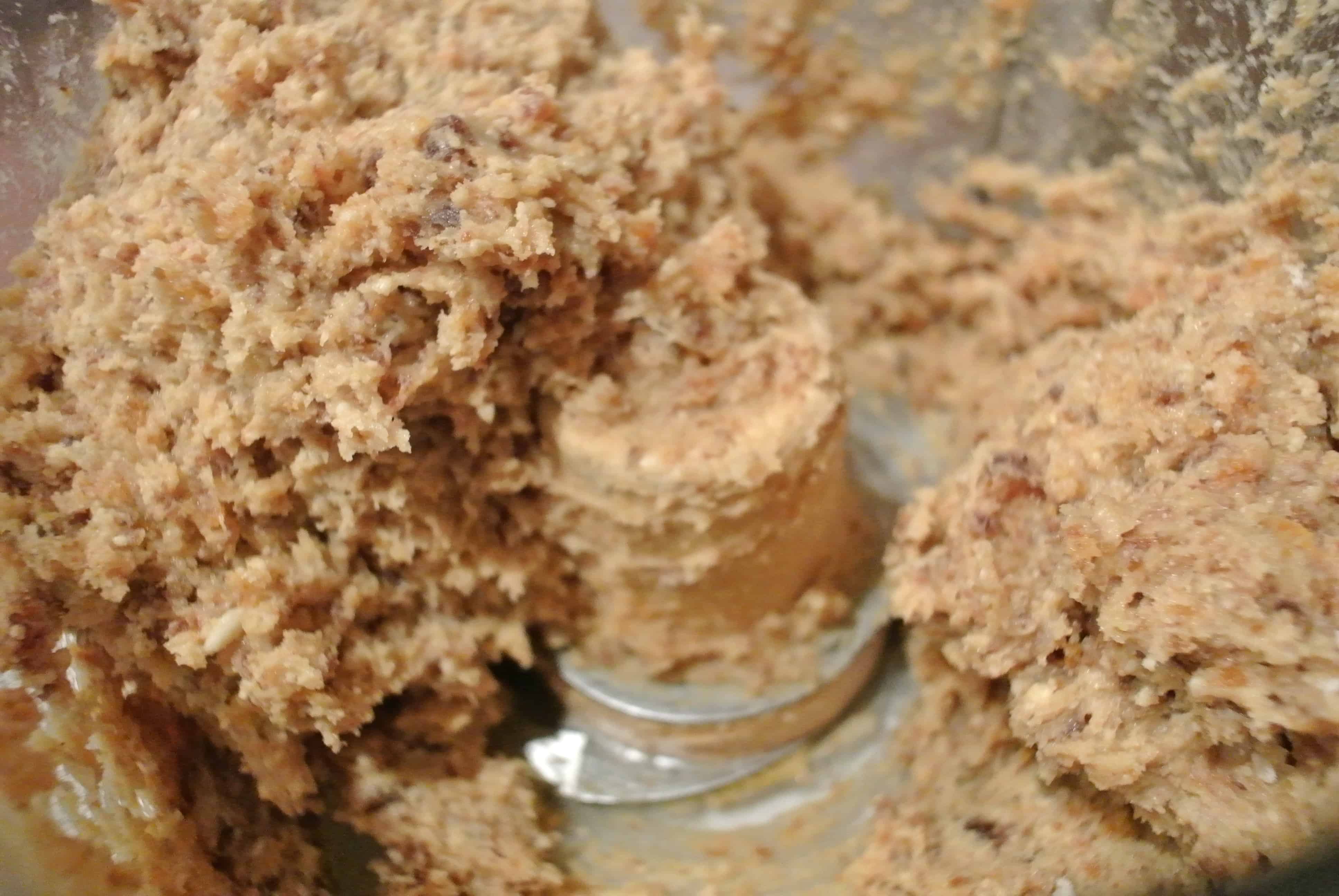 Start by adding the flour, cashews, and pitted dates to your food processor bowl with the blade attachment. Process these ingredients until they are a sandy consistency. Add the baking powder and baking soda and process again until thoroughly combined.