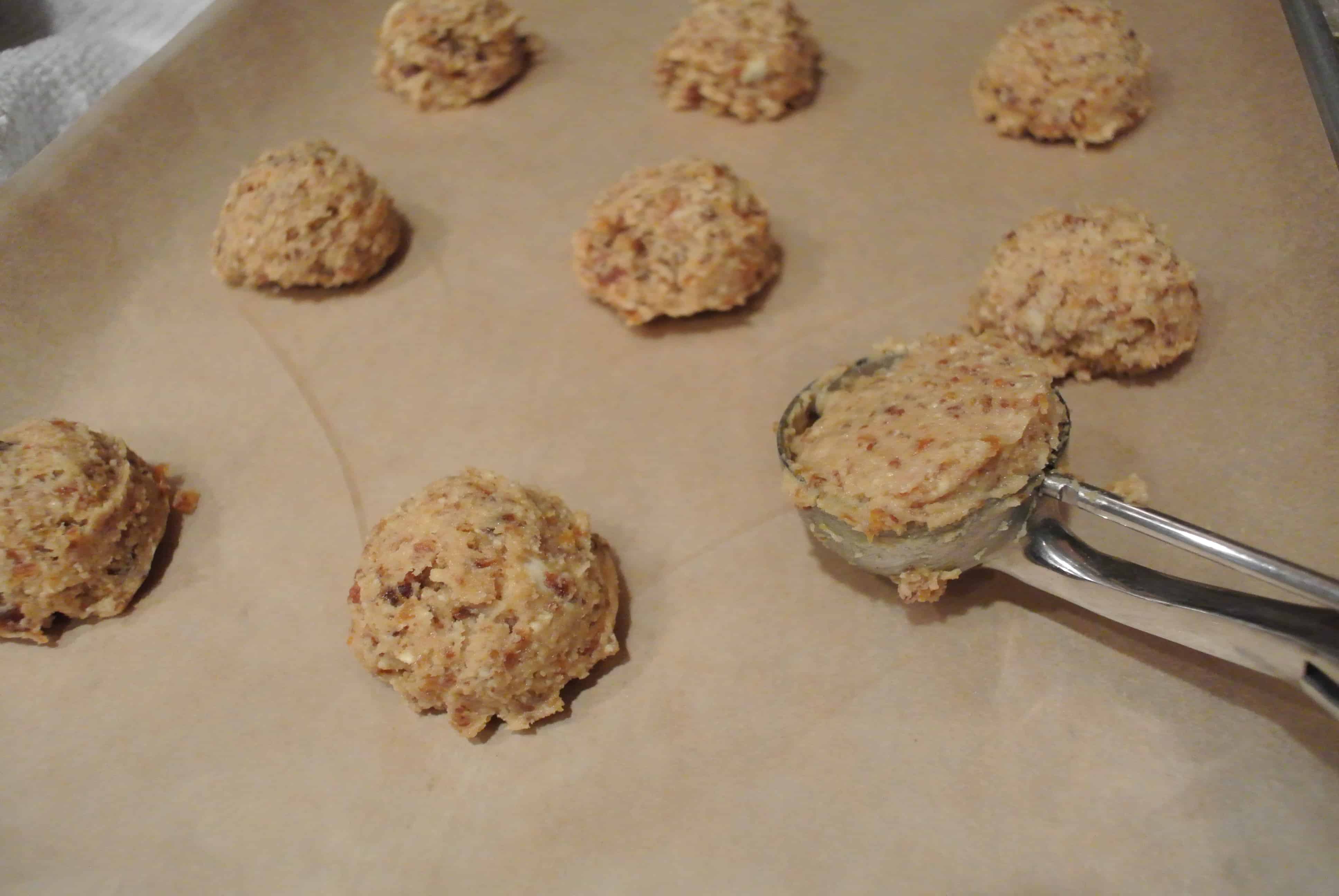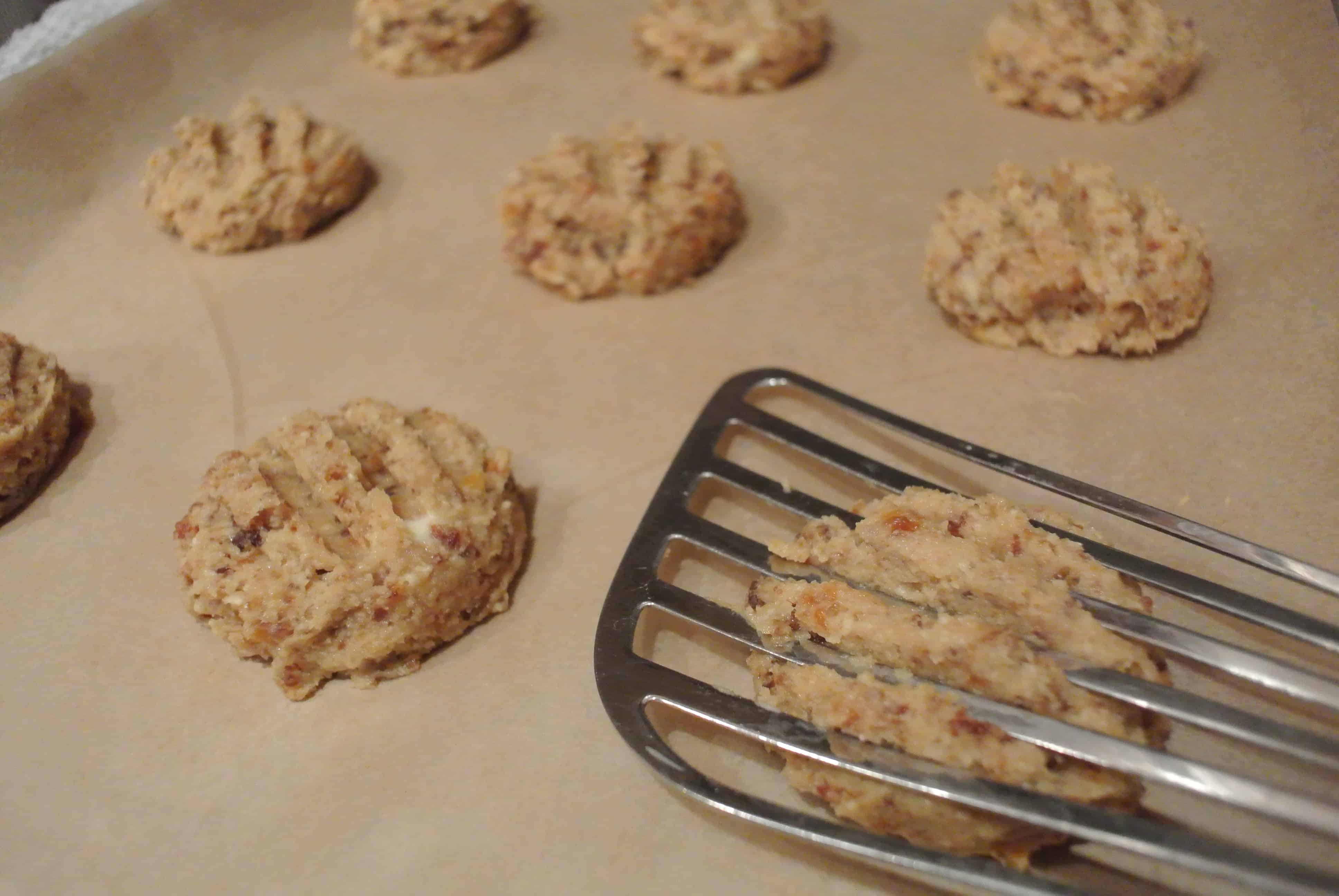 Scoop the dough onto a parchment-lined baking sheet using a 2-ounce scoop. Flatten each cookie with a slotted spatula.