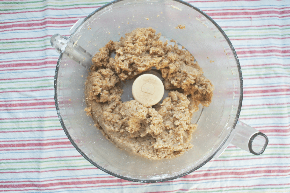 In your food processor bowl with the blade attachment combine the flour, pecans, and dates. Process these ingredients until they are fine and sandy. Add the butter and vanilla and process again until a nice dough forms.