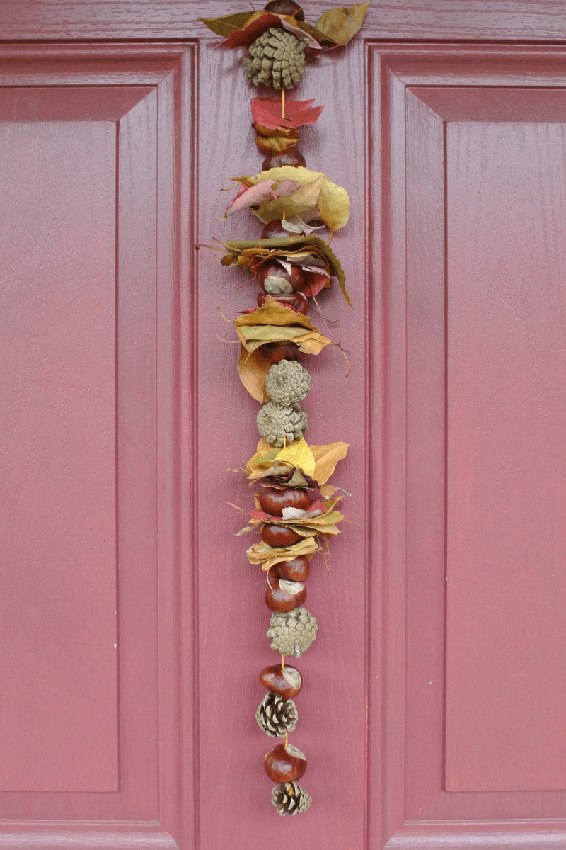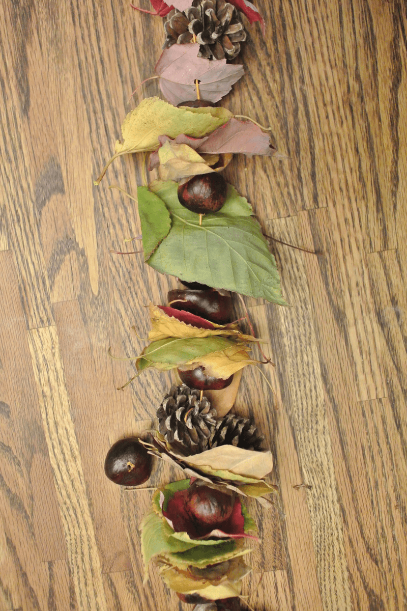 Collect a variety of colored leaves, pinecones, and seedpods (like the inedible horse chestnut or Japanese lantern pictured here).