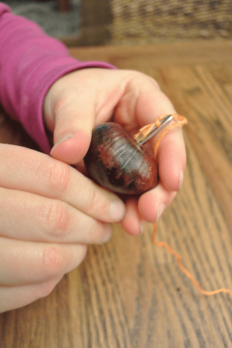 String the needle with about 24 inches of embroidery floss. Tie a small knot at the needle end to keep the floss from slipping through. This may not be needed with heavier yarn. Tie a double or triple knot in the end. Let the child string leaves and seedpods onto the floss. Pinecones can be tied onto the floss by wrapping around the center of the cone one time and using the needle to slip around and under the base thread before continuing with more leaves and seeds. When the floss is full, remove the needle and tie a knot with a loop for hanging.