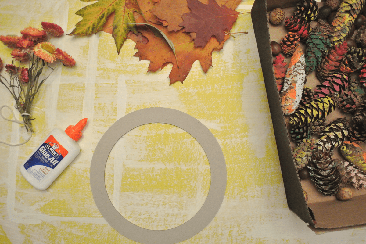 Bring all your supplies to a work surface where you can use a hot glue gun. Start by using hot glue or craft glue to attach the leaves to the wreath frame.