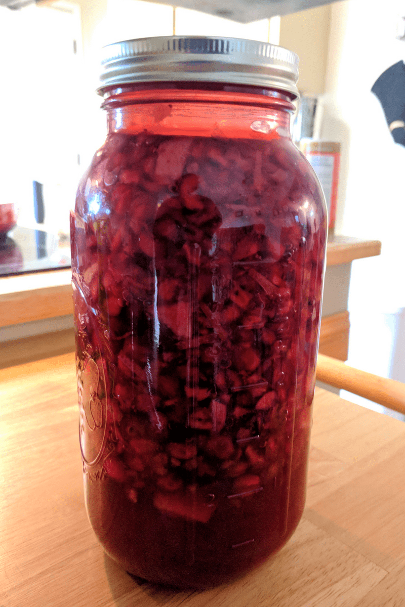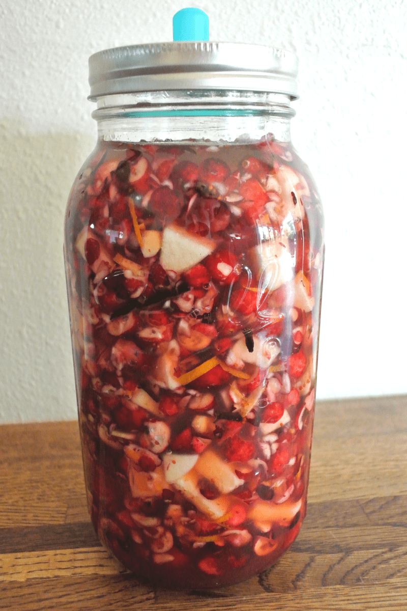 I took my cranberry sauce in a whole new direction this year when I started reading about fermented cranberries. Like peeled whole garlic, whole cranberries can be covered in raw honey and left to ferment for up to 1 year! That got my creative juices flowing and I came up with a recipe that uses a honey brine instead of straight honey. I was interested in a quicker ferment that would give me a less sugary, pleasantly sweet result. So in the true nature of creativity I winged it and came up with a completely original recipe.