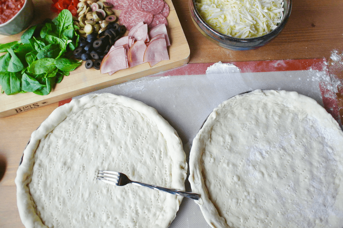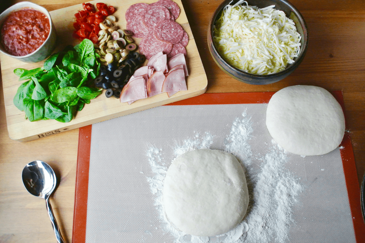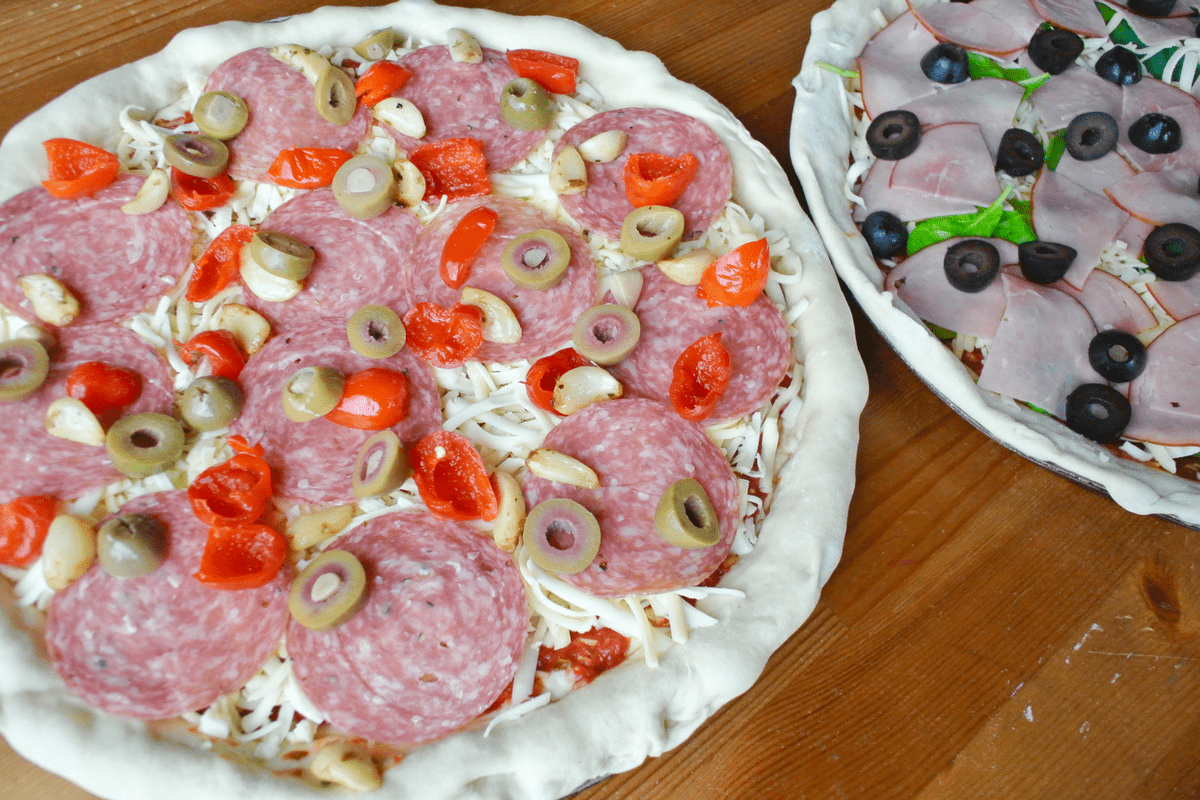 - Arrange your toppings on a large platter, cutting board, or tray for easy access. For these pizzas I picked salami, green olives, peppadew peppers, and roasted garlic for one pie and ham, spinach, and black olives for the other. This is the fun part! Get creative with those toppings!