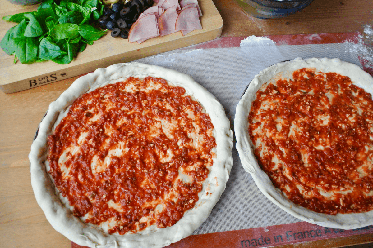 - Using a wide spoon, add sauce to both pizzas. Then top the sauce with cheese and your favorite toppings. Pro Tip: If you are using spinach or another leafy green, add it to your pizza between the sauce and cheese layer. This will keep the spinach from burning and drying out!