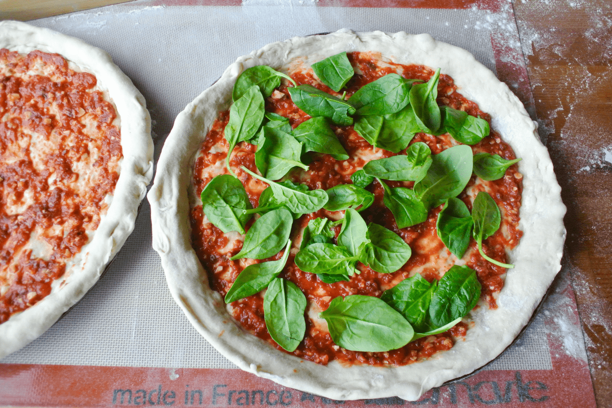 Pro Tip: If you are using spinach or another leafy green add it to your pizza between the sauce and cheese layer. This will keep the spinach from burning and drying out!